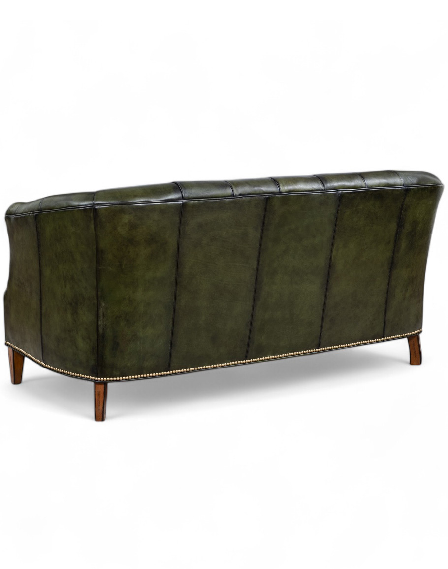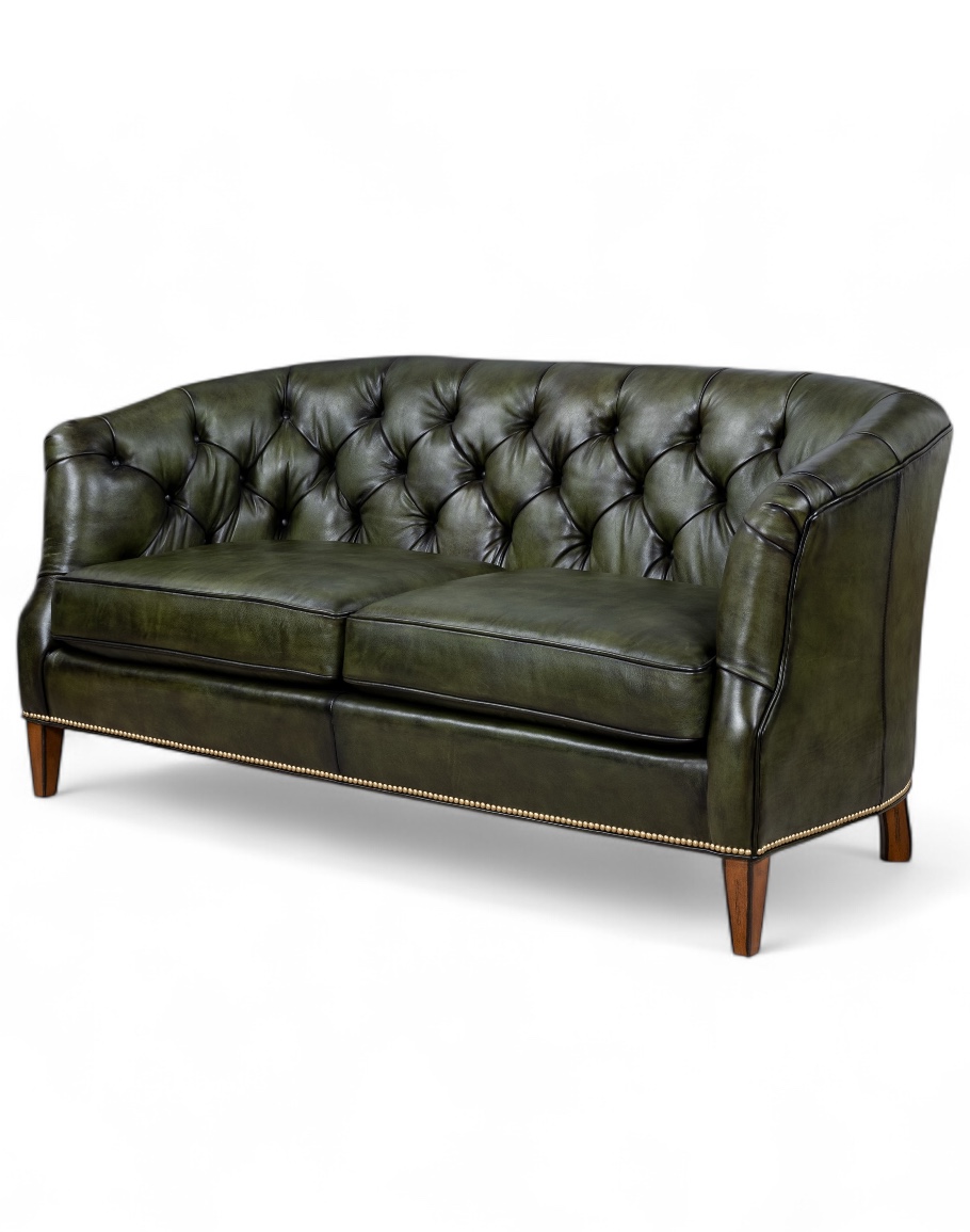 The Audrey Olive Tufted Leather Settee is a refined statement of timeless craftsmanship and Western-inspired luxury. Handcrafted in the USA to the highest standards, this piece showcases meticulous button tufting across the gently curved backrest, creating an elegant interplay of depth and dimension. Upholstered in full-grain leather with a rich olive green patina, the surface reveals tonal variations that highlight the supple texture and artisanal burnishing. Its tailored silhouette is accented with a line of antique brass nail tacks along the base, while tapered wooden legs provide a sturdy yet graceful foundation.