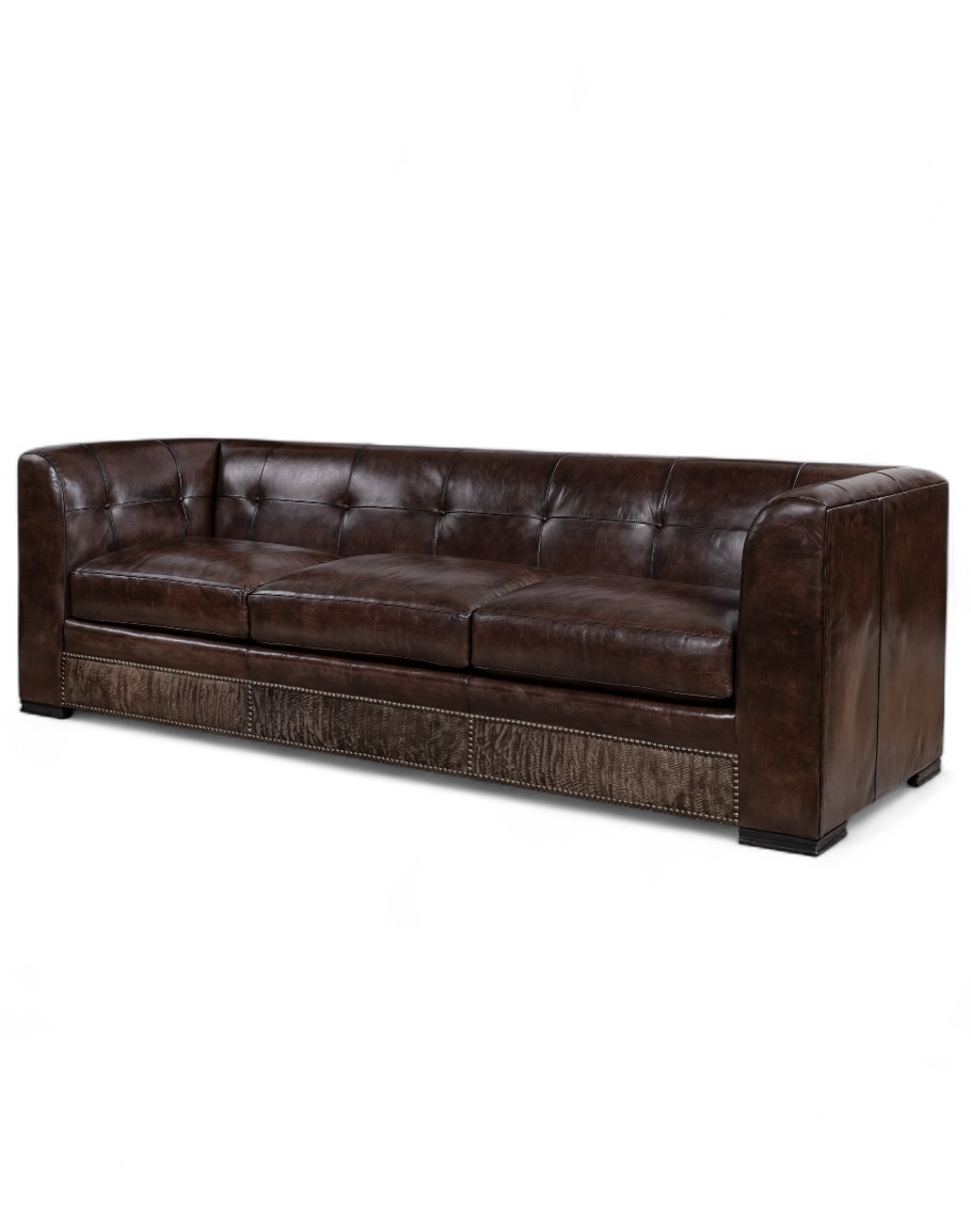 The sofa’s tufted inside back adds tailored elegance, while its plush, down-blend seat cushions ensure exceptional comfort. A distinctive design element is the contrasting embossed leather paneling along the front rail, finished in a textured pattern that adds depth and dimension. This detail is framed with antique brass nailhead trim, creating a sophisticated transition between materials.