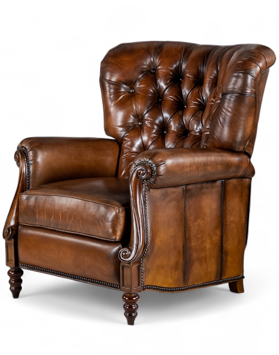 The Camden Recliner is designed to look as good in a stately study as in a vibrantly decorated living room. Featuring genuine, hand-burnished leather, rich studding detail and a sturdy frame, this upscale recliner is an instant classic and classics never go out of fashion. Leather-bound books, well-aged whiskey and fine cigars come to mind when you look at the Camden Recliner. And when you sit down in its gloriously soft leather seat, all you will be able to think about is how comfortable you feel. All of that is supported by a handcrafted solid hardwood frame, so you never have to worry about the dependability of this high end recliner chair. Like a fine wine or expensive violin, the Camden Leather Recliner only grows richer and more enjoyable as time passes. Invest in this fine quality recliner today, and reap the many benefits for years to come. 100% American made to the highest quality of standards!