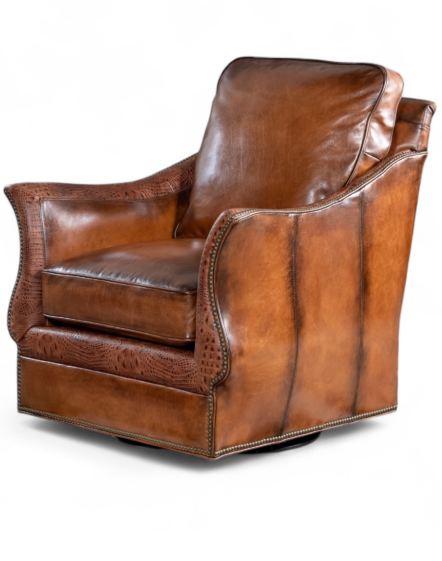 The Calexico Leather Swivel Glider Chair features supple hand burnished leather and comfort down seat and back cushions. The Calexico is part of The Remington Tanner Collection and 100% American Made to the highest standards of quality!
