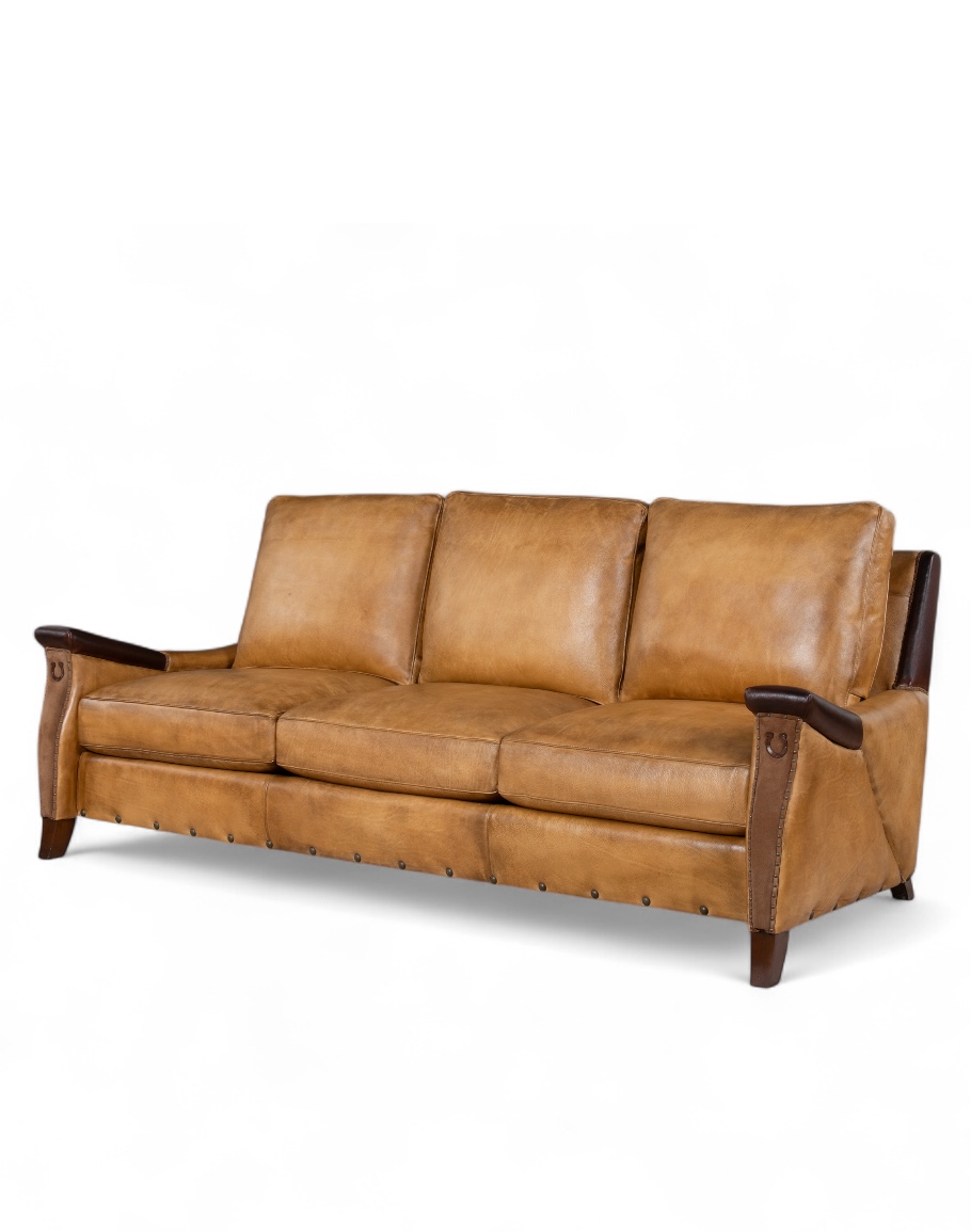 Enhancing its charm, the sofa includes fine suede leather on the arm panels, accented with a distinctive leather horseshoe detail that nods to classic ranch style. The meticulous application of brass nail tacks along the edges adds a touch of elegance while reinforcing its sturdy design. Elevate your living space with the Lucky Leather Sofa, where exceptional craftsmanship meets timeless design.
